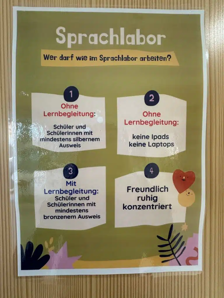 Ab der dritten Stunde sind die Hauptfächer an der Tagesordnung: Bis zum Ende des Vormittages arbeiten die Schülerinnen und Schüler an niveaudifferenzierten Lernwegelisten und bekommen auch immer wieder niveaudifferenzierte Inputs. Wo sie lernen, dies hängt vom „Lernpass“ ab: Mit dem „Lernpass Bronze“ darf man im Klassenzimmer lernen, mit dem „Lernpass Silber“ in den offeneren Lernbüros und mit dem „Lernpass Gold“ sogar, wo man will, zum Beispiel in der Bibliothek. Die Steigerung der Graduierung muss man sich durch entsprechendes Arbeitsverhalten erarbeiten.
